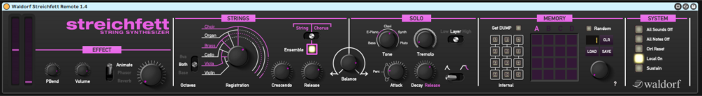 Waldorf Streichfett Remote Controller for Ableton Live with Max4Live with randomizer and 4 banks with 16 preset-slots.