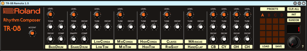 TR-08 Remote Controller for Ableton Live with Max4Live with randomizer and 4 banks with 16 preset-slots.